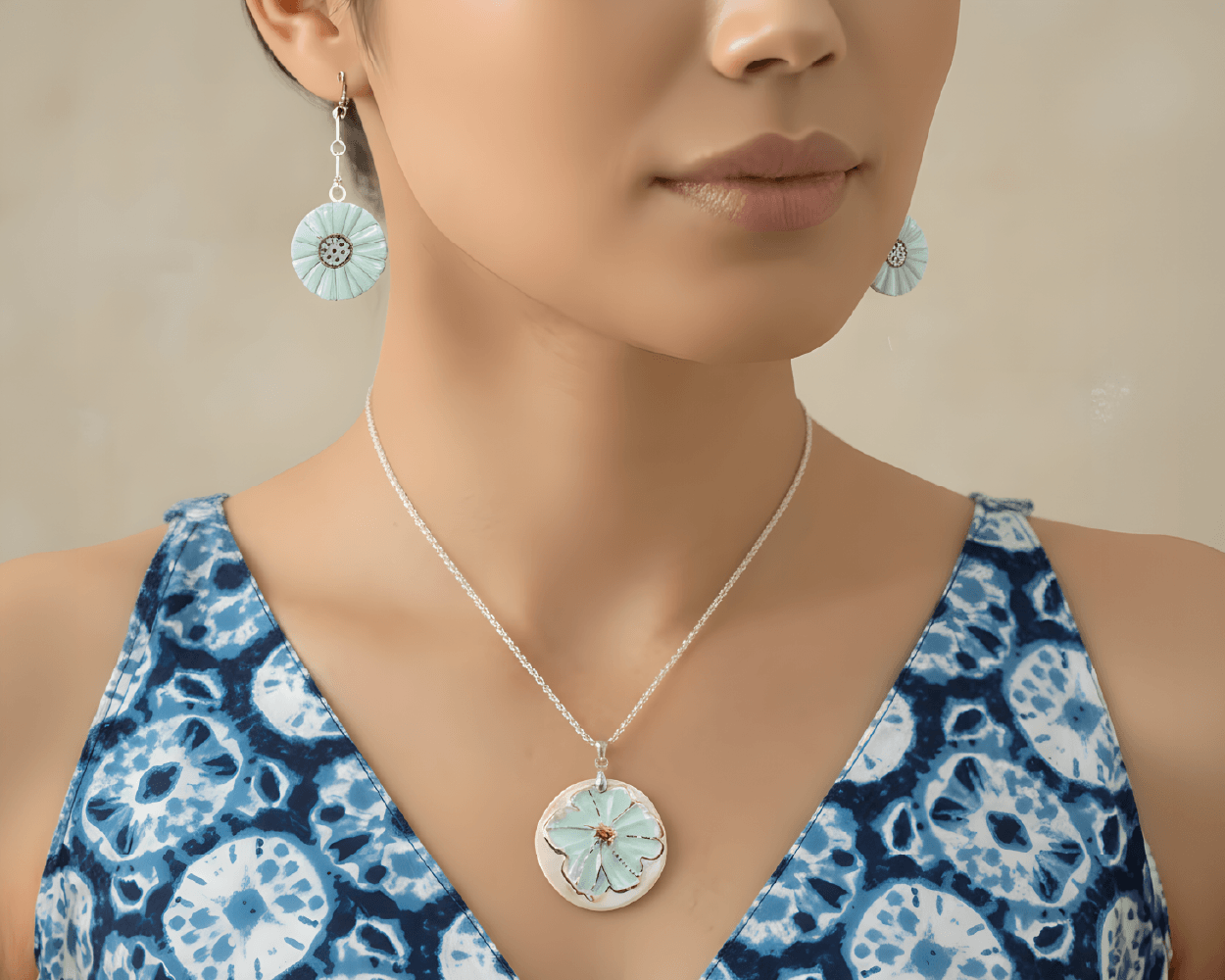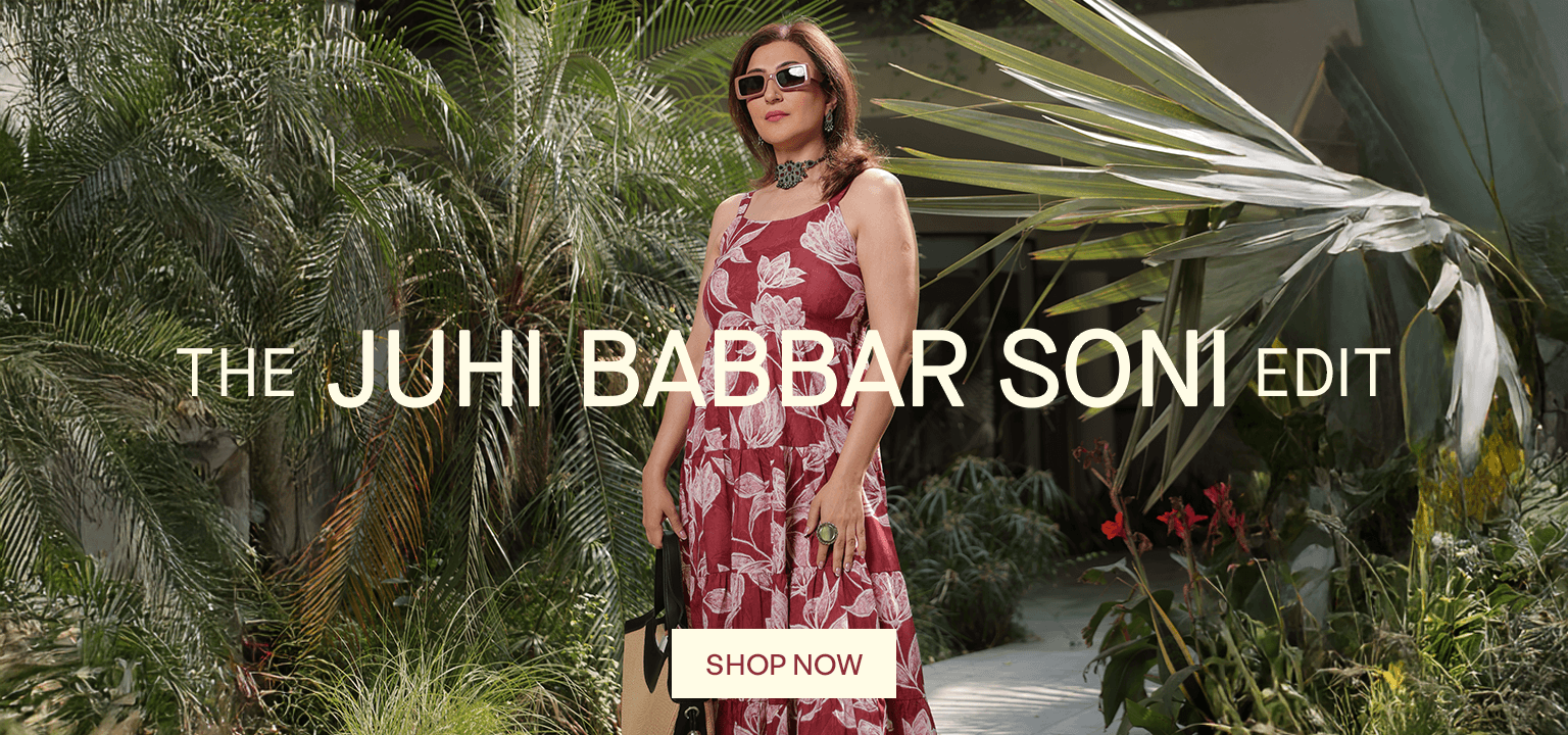 Elevate the look with artisanal handcrafted jewellery that enhances the dress with subtle luxury.