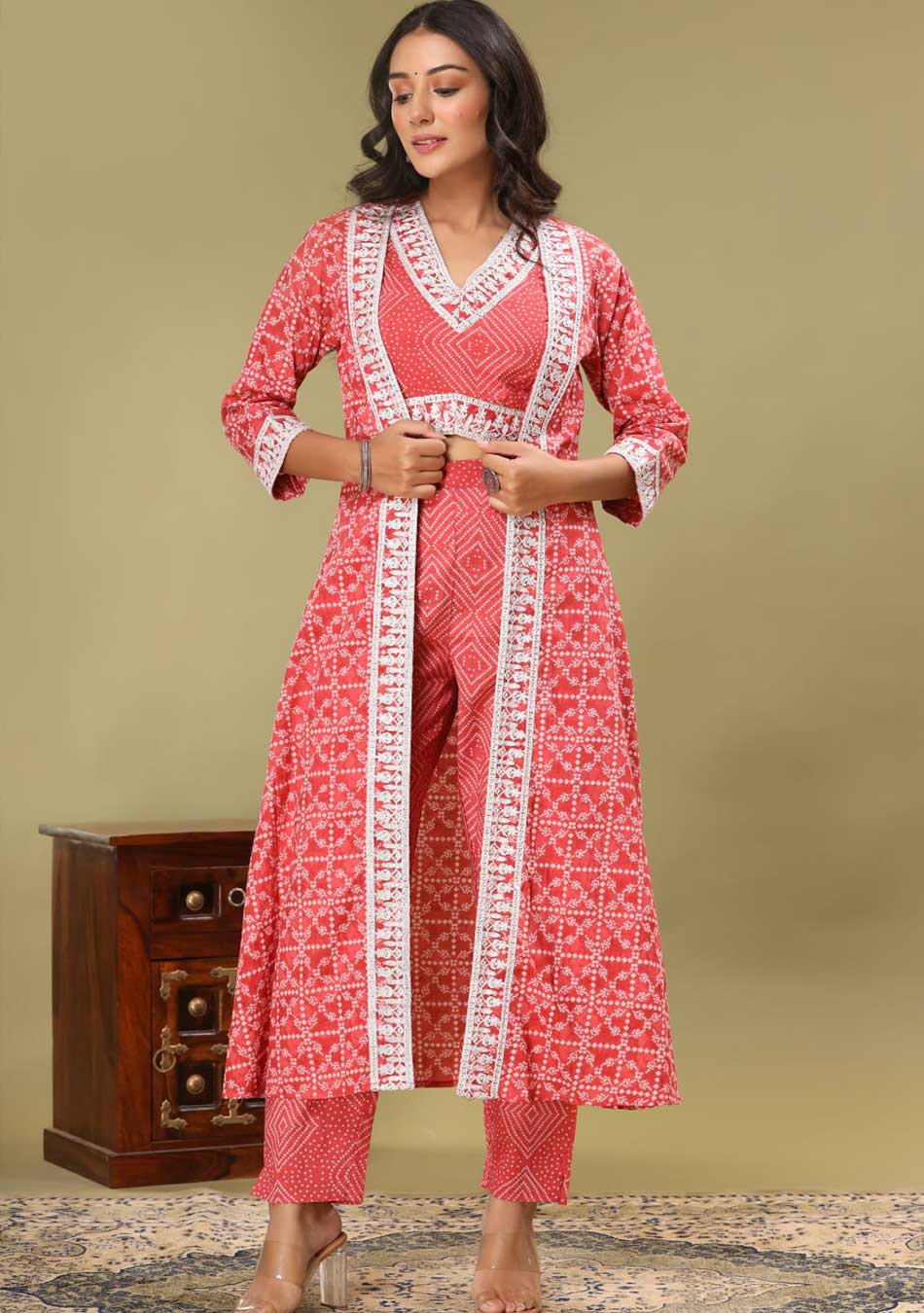 - This elegant coral chunri print blouse and pant set is perfect for both formal and casual occasions. It comes with a full sleeve cape on top of the set.