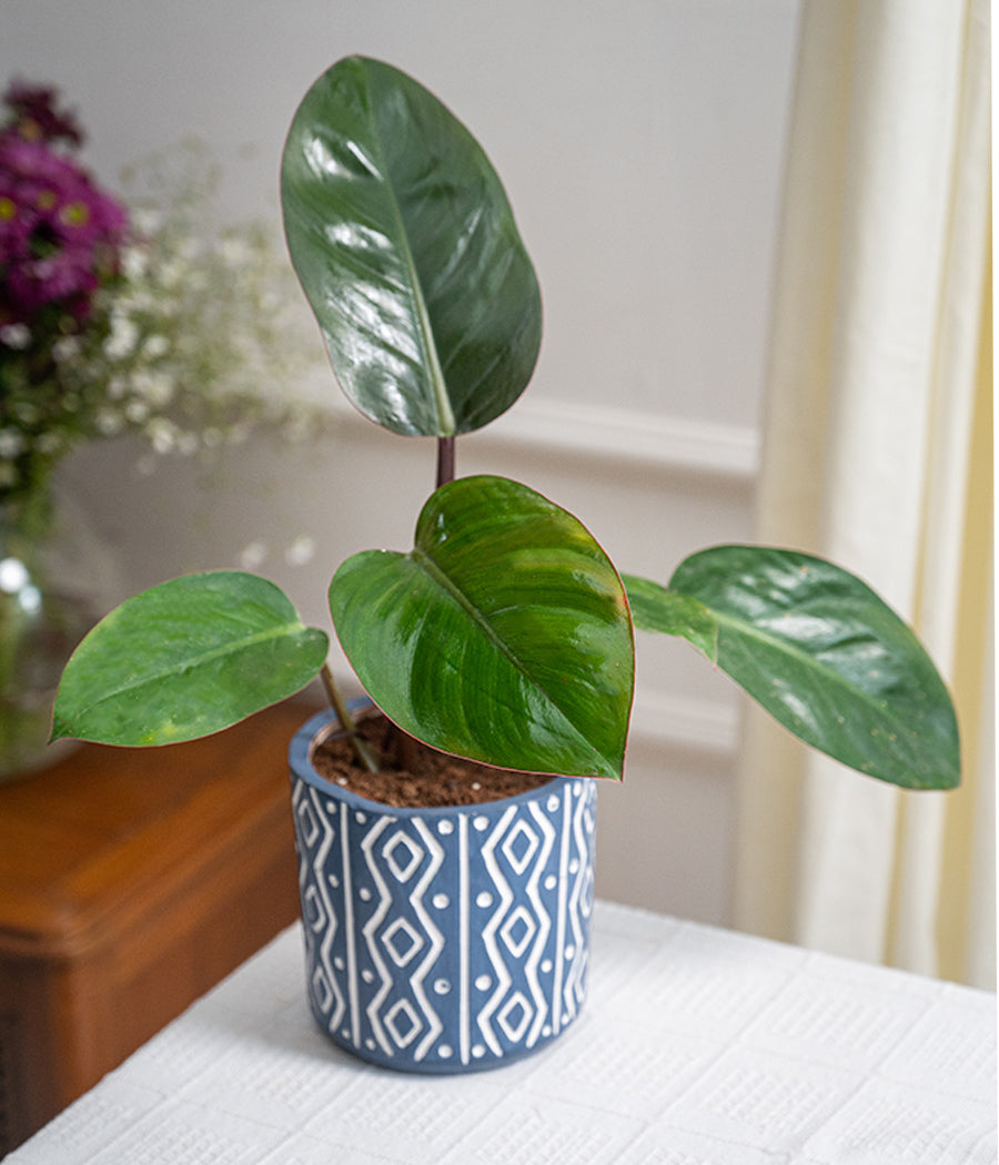 - The plant is potted in a navy blue Ceramic planter with white tribal pattern engravings.